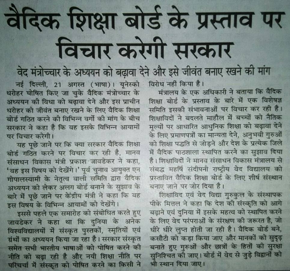 | 22/08/2016 | Vaidik Shiksha Board ke Prastaav par Vichar karegi Sarkar | Jansatta |